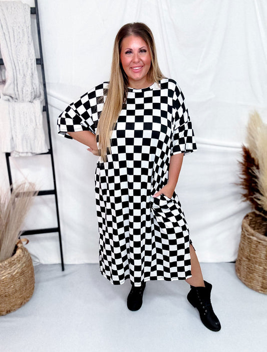 Black and White Checkered Hi-Lo V-Neck Dress with Side Slit