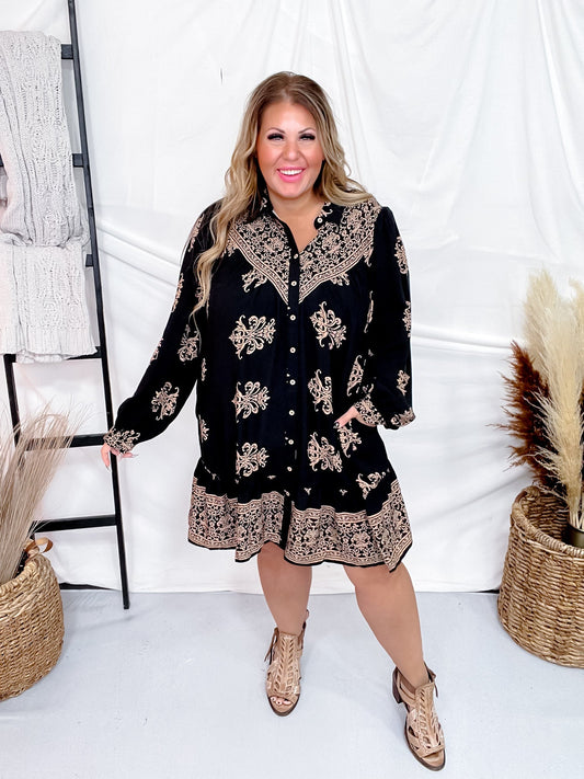 Black Paisley Print Long Sleeve A-Line Dress FINAL SALE